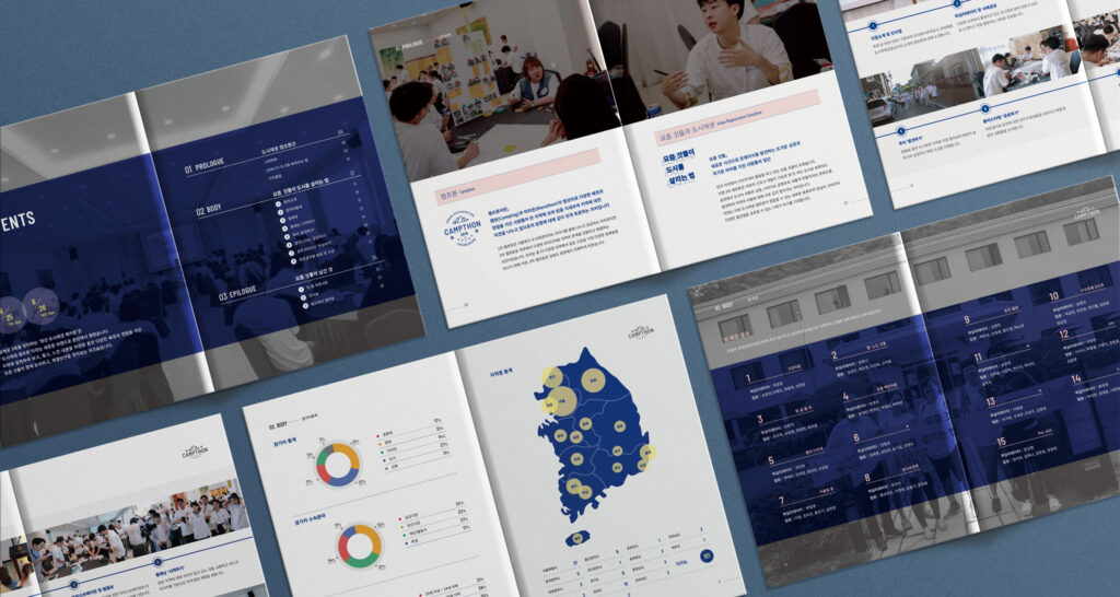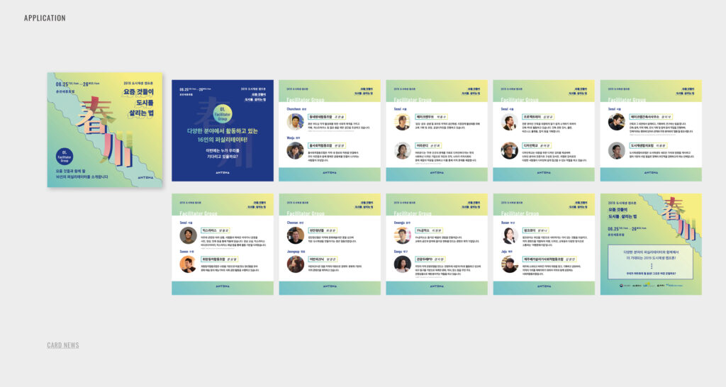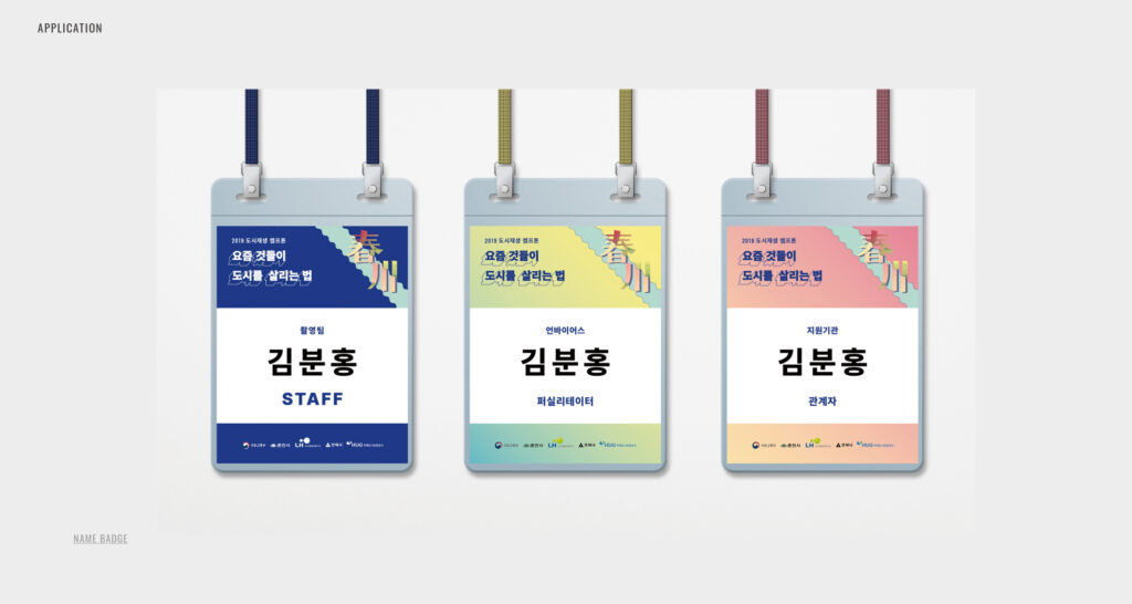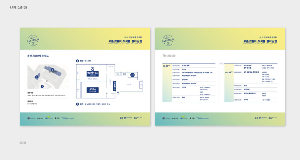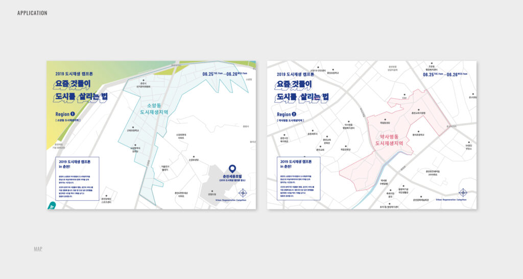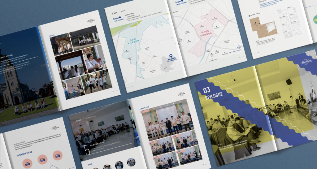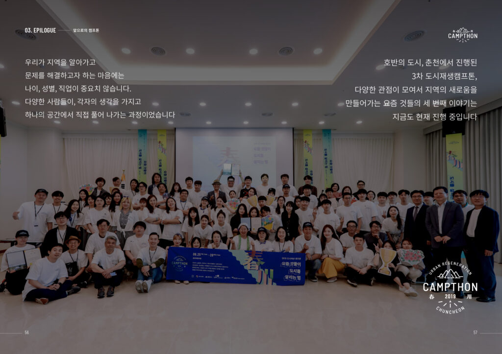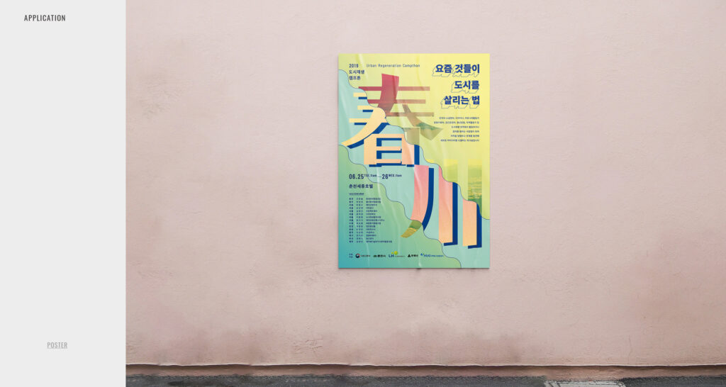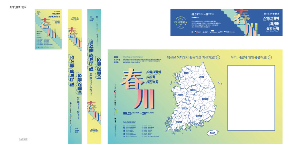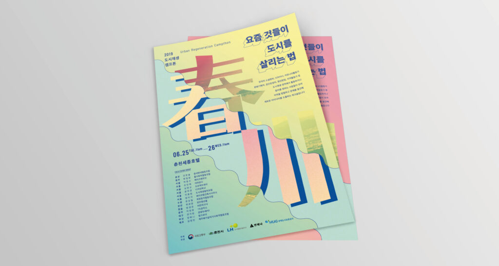 춘천에서 진행된 제3회 청년 도시재생 캠프톤. 디자인씽킹을 통해 지역 청년들이 도시재생 아이디어를 발굴하고 공공기관·전문가와 협력하여 실행 모델을 구상. 키비주얼 및 행사 운영 전반 담당