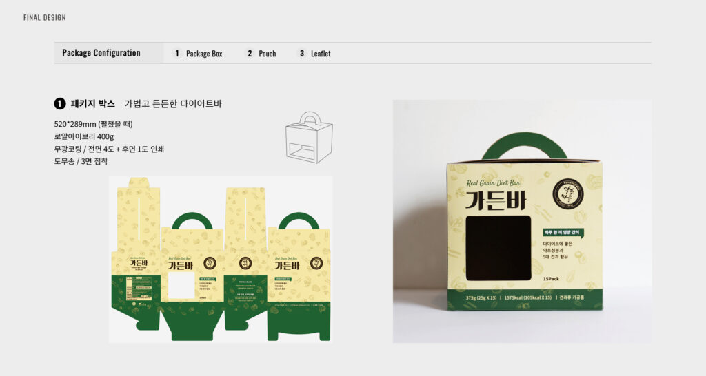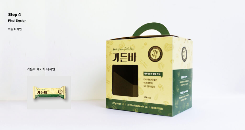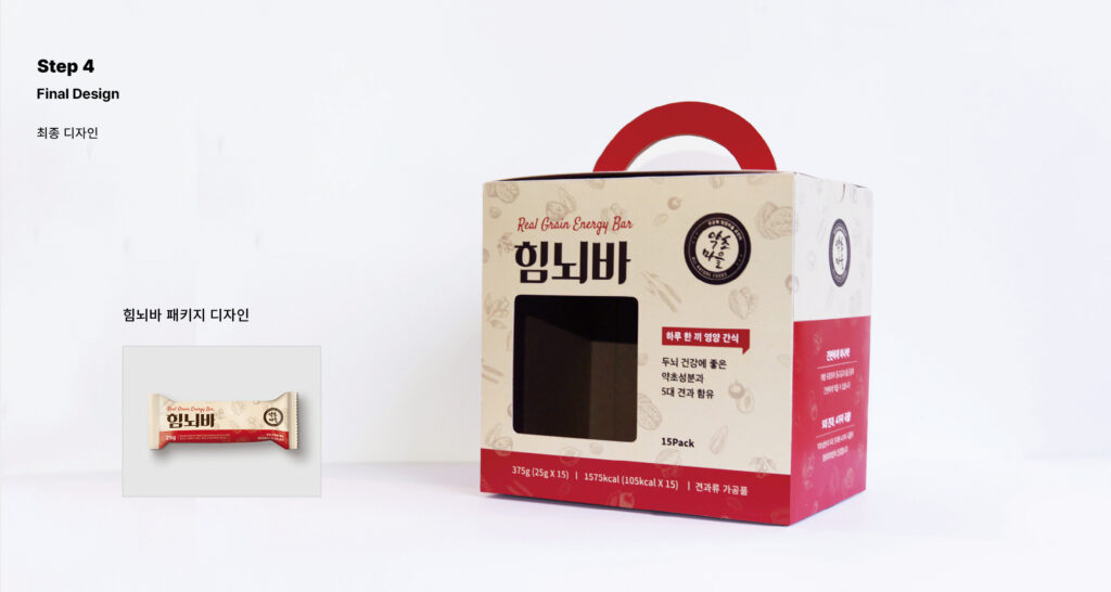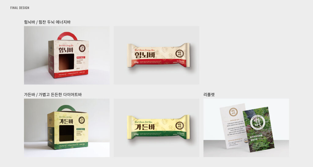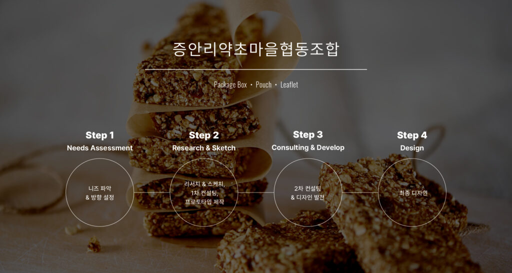 지역 농산물 브랜드의 경쟁력 강화를 위한 디자인 지원 사업으로, 증안리약초마을협동조합의 곡물 에너지바 제품에 건강함과 자연 친화적 이미지를 담은 패키지 아이덴티티를 구축