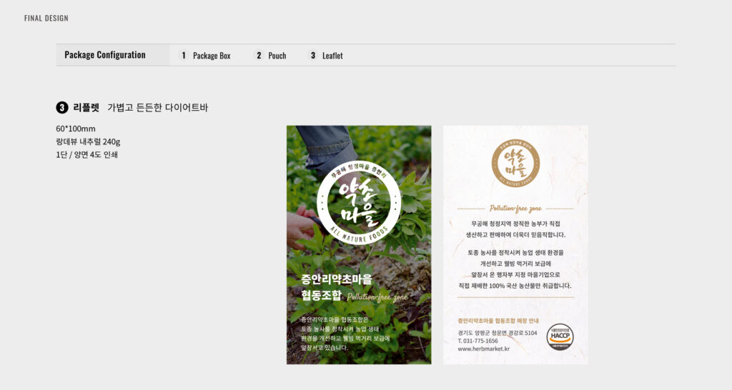 • Leaflet: 약초마을의 생산 배경과 철학을 소개하는 홍보 리플렛 제작