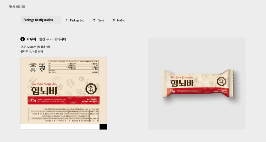 패키지 전면에는 원료 그래픽을 은은하게 배치하여 건강한 에너지를 시각적으로 표현했습니다.
