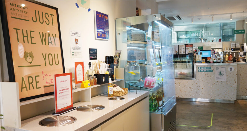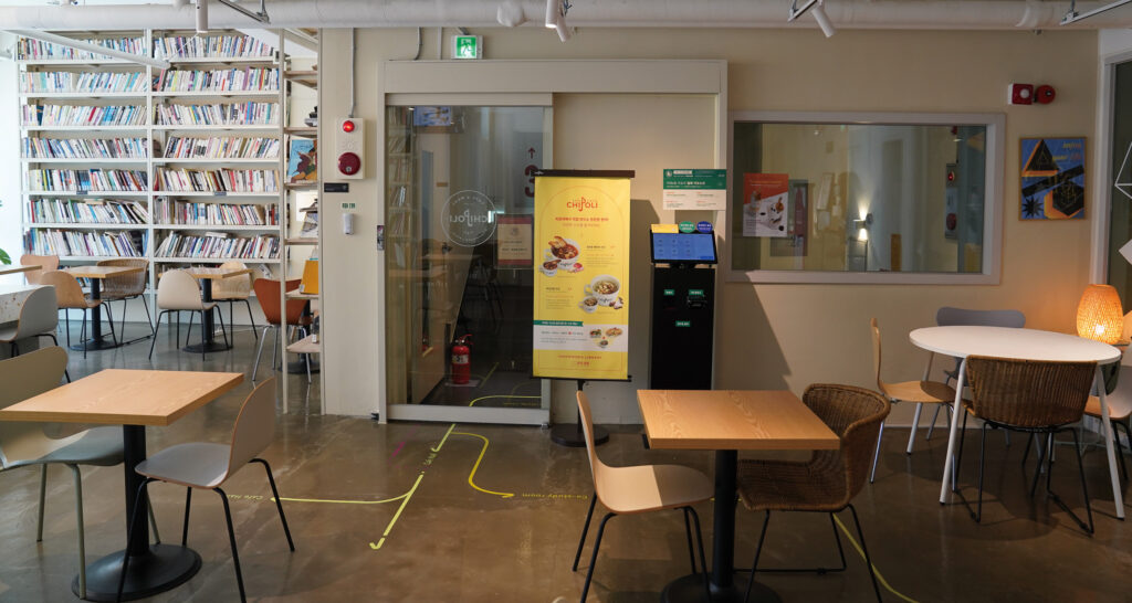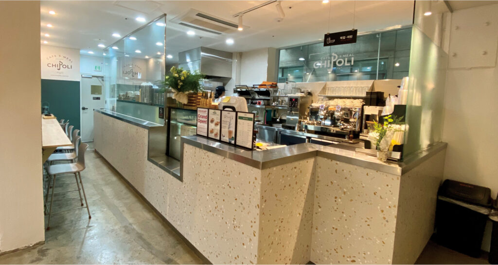 테이크아웃과 1인 좌석 중심의 공간, 오픈 키친