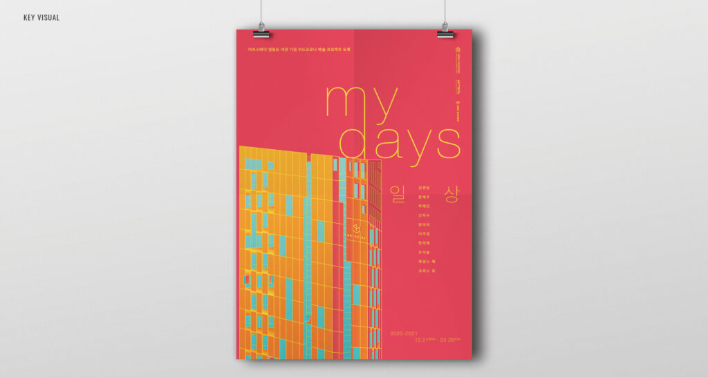 기존 호텔 건물을 리모델링하여 조성된 1인 주거형 공간에서 열린 전시, my days 일상 전시 키비주얼 및 도록 진행