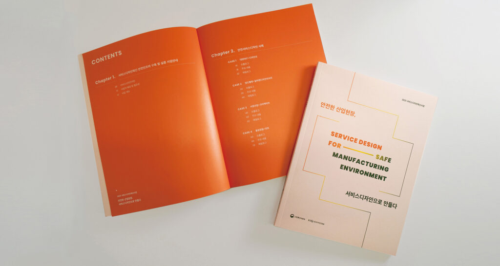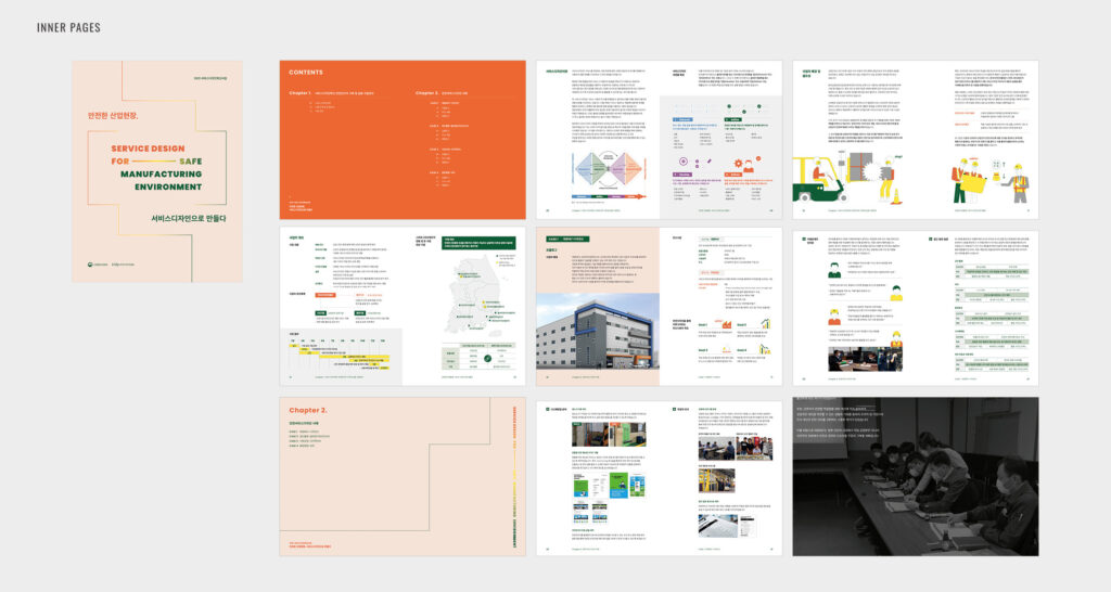 서비스디자인 기반의 안전환경 개선 프로젝트 내용을 바탕으로, 일관된 편집 구조와 선형 그래픽을 활용한 직관적인 보고서 디자인을 디렉팅