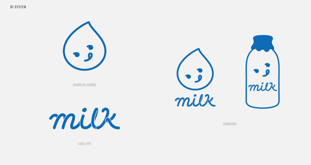 우유를 상징하는 캐릭터 심볼과 부드러운 쉐입의 로고타입은