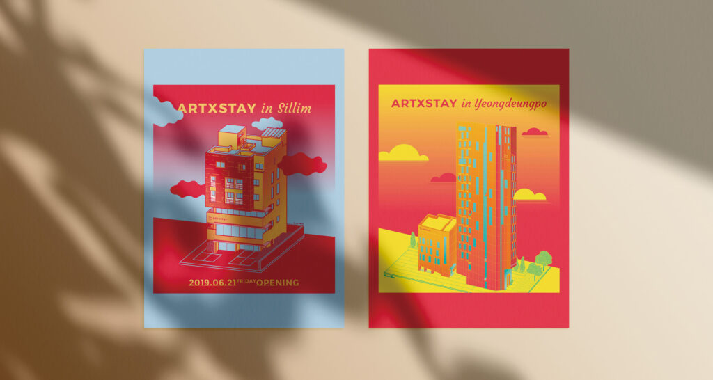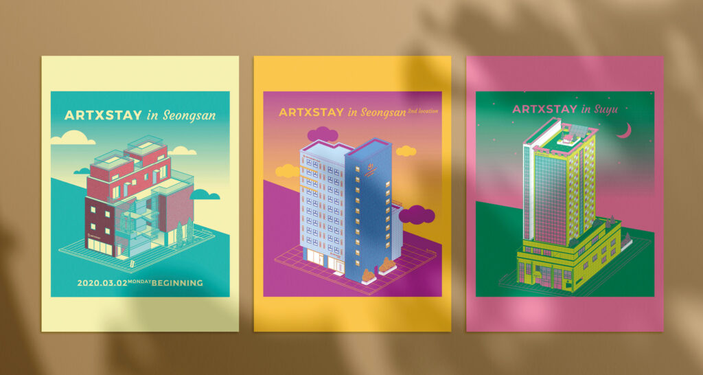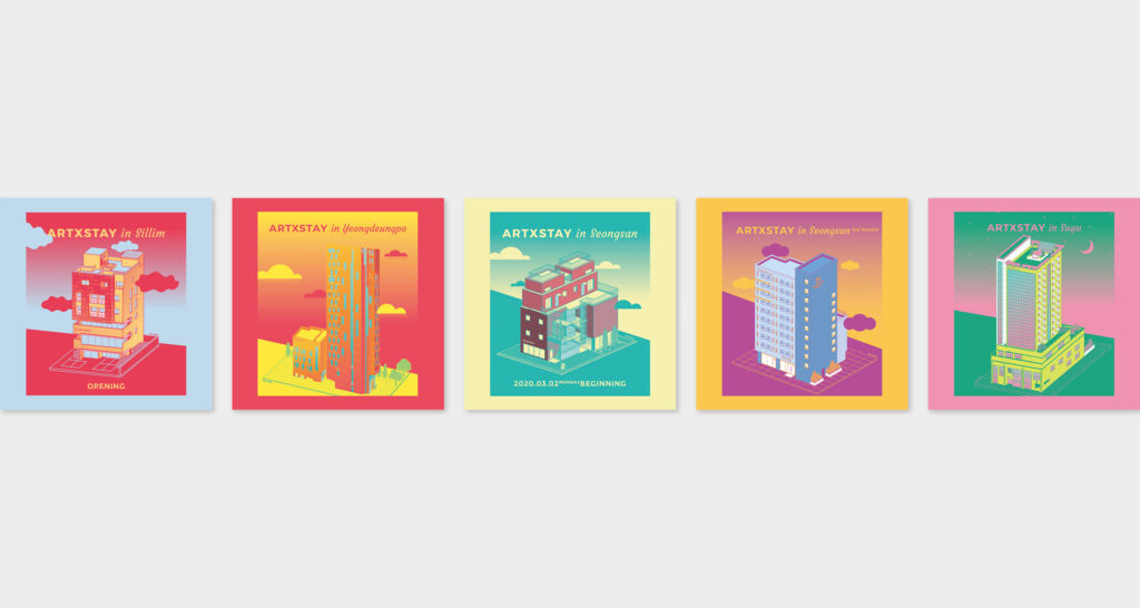 ARTXSTAY 브랜드의 지역별 아이덴티티를 통합적으로 구축하는 핵심 그래픽으로 사용되었습니다.